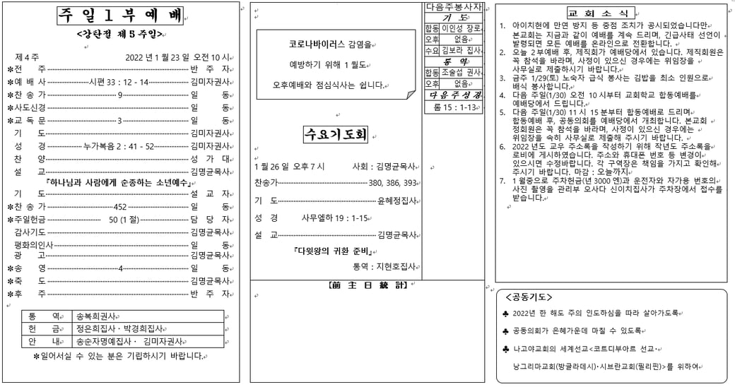 재일 대한 기독교 회 나고야 교회 2022 년1월23일 주일1부예배(한국)
