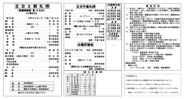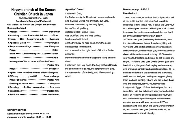 週報・礼拝動画/주보·예배 동영상 · 2025/09/07 【礼拝動画】2025年9月7日主日 礼拝メッセージ 재일대한기독교회 나고야교회 2025년9월7일 한국어예배 クッキーの設定によりYoutubeのコンテンツが表示されません。Youtubeのコンテンツの読み込みと表示を行う場合は、クッキーバナーよりYoutubeのクッキーを受け入れてください。 성경: 신명기10:12-22 제목:『마음의 굳은살을 베어내라』 설교:김명균목사 在日大韓基督教会 名古屋教会2025年 9月7日 2部礼拝(日本語) クッキーの設定によりYoutubeのコンテンツが表示されません。Youtubeのコンテンツの読み込みと表示を行う場合は、クッキーバナーよりYoutubeのクッキーを受け入れてください。 聖書:申命記10:12-22 題目:『頑なな心を切り捨てなさい』 説教:金明均牧師 tagPlaceholderカテゴリ: service コメントをお書きください コメント: 0