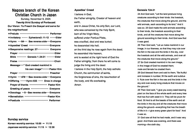 在日大韓基督教会 名古屋教会2025年 11月9日2部礼拝
