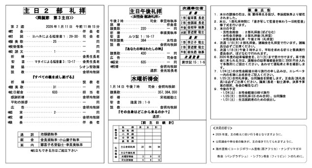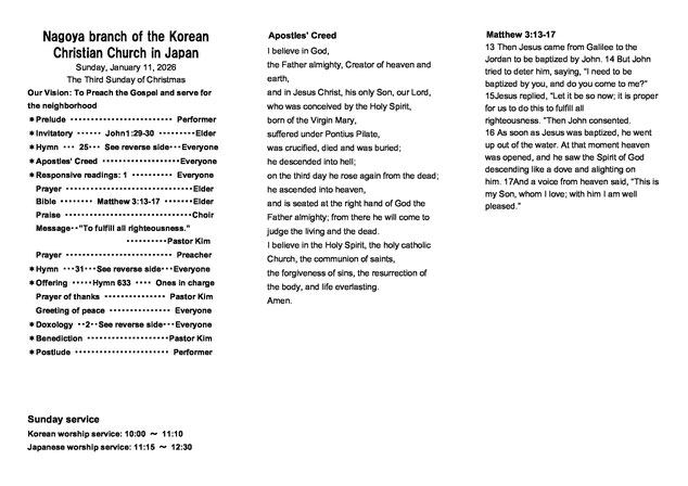 週報・礼拝動画/주보·예배 동영상 · 2026/01/18 【礼拝動画】2026年1月18日主日 礼拝メッセージ 재일대한기독교회 나고야교회 2026년1월18일 한국어예배 クッキーの設定によりYoutubeのコンテンツが表示されません。Youtubeのコンテンツの読み込みと表示を行う場合は、クッキーバナーよりYoutubeのクッキーを受け入れてください。 성경:창세기:15:1-6 제목:『나의 방패요 상급이신 주』 설교:김명균목사 在日大韓基督教会 名古屋教会2026年 1月18日2部礼拝 クッキーの設定によりYoutubeのコンテンツが表示されません。Youtubeのコンテンツの読み込みと表示を行う場合は、クッキーバナーよりYoutubeのクッキーを受け入れてください。 聖書:創世記15:1-6 題目:『わたしの盾、報いて下さる主』 説教:金明均牧師 tagPlaceholderカテゴリ: service コメントをお書きください コメント: 0